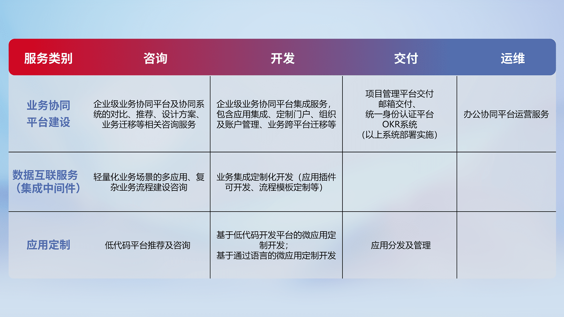 针对钉钉、、、、企微、、、、IDaas等平台级产品提供产品的规划、、、、方案、、交付、、定制化开发等服务,,,,实现如统一协同办公、、、智能客户服务、、、混合会议管理、、、智能数据查询、、、等业务场景,,实现数字化转型。。